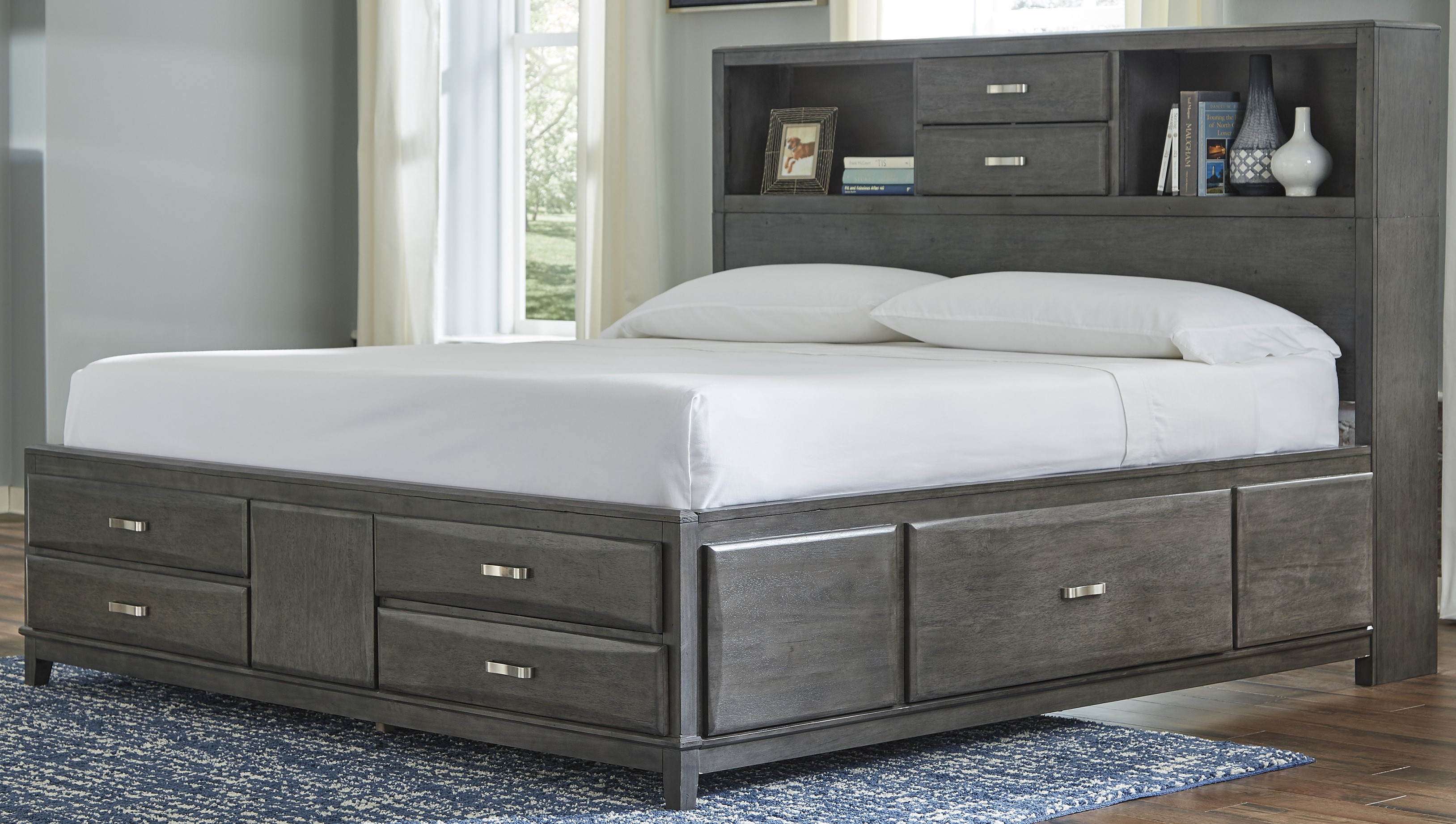 There’s no shortage of storage on the Caitbrook queen storage bed. Eight drawers and 2 open cubbies let you stow bedroom basics and display your precious belongings.