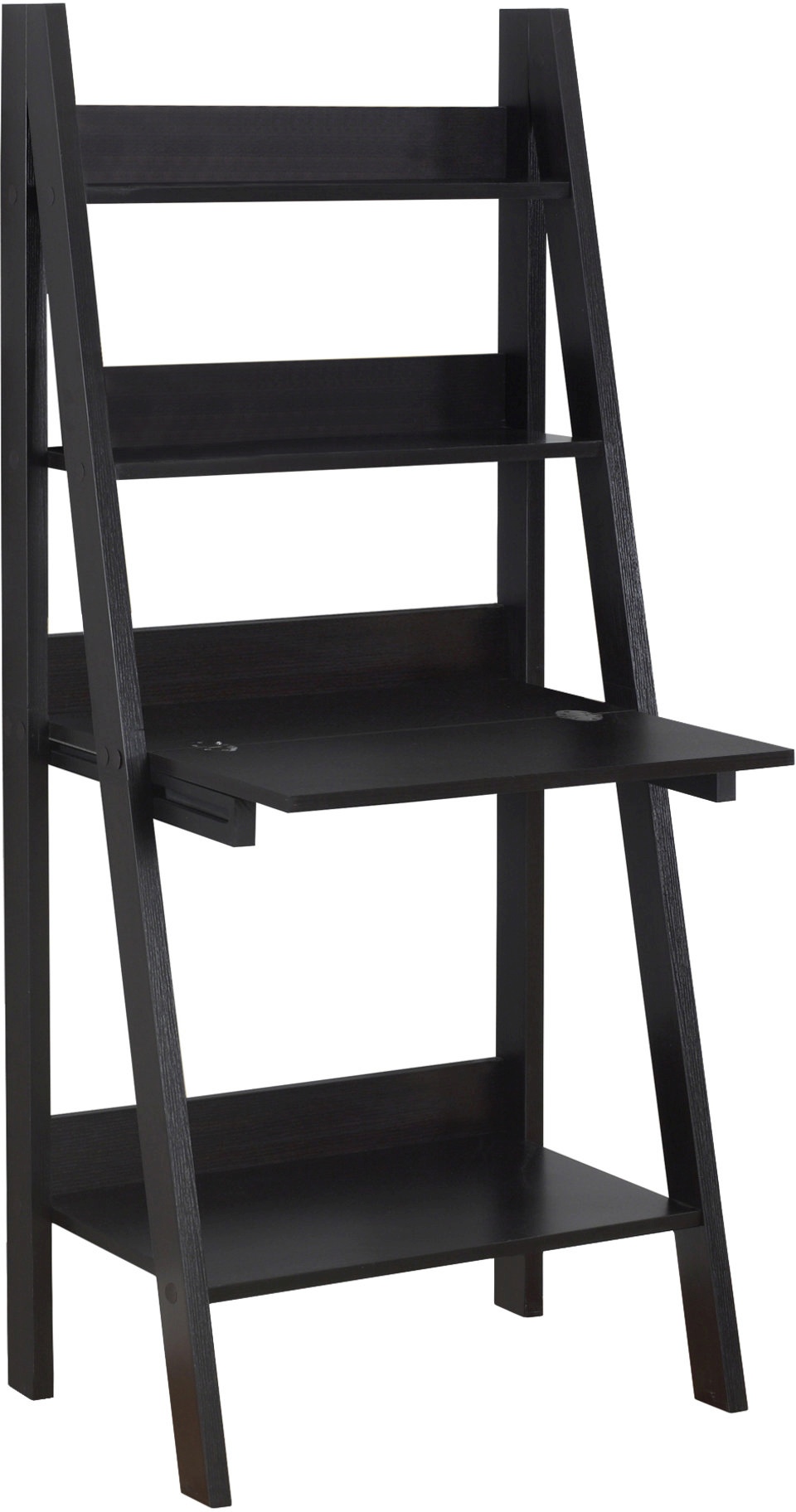 This multifunctional computer desk / bookcase offers a compact work space that is ideal for apartments, condos, or small homes. With clean lines in a rich cappuccino finish, this desk will blend easily with your home decor. The top ladder style shelves can be used to display pictures and decorative pieces, while the closed storage area can be dropped down into a desk, with an additional bottom shelf for books or accessories. Add this convenient and functional workstation in your home where ample storage options, excellent functional features, and sophisticated style come together.