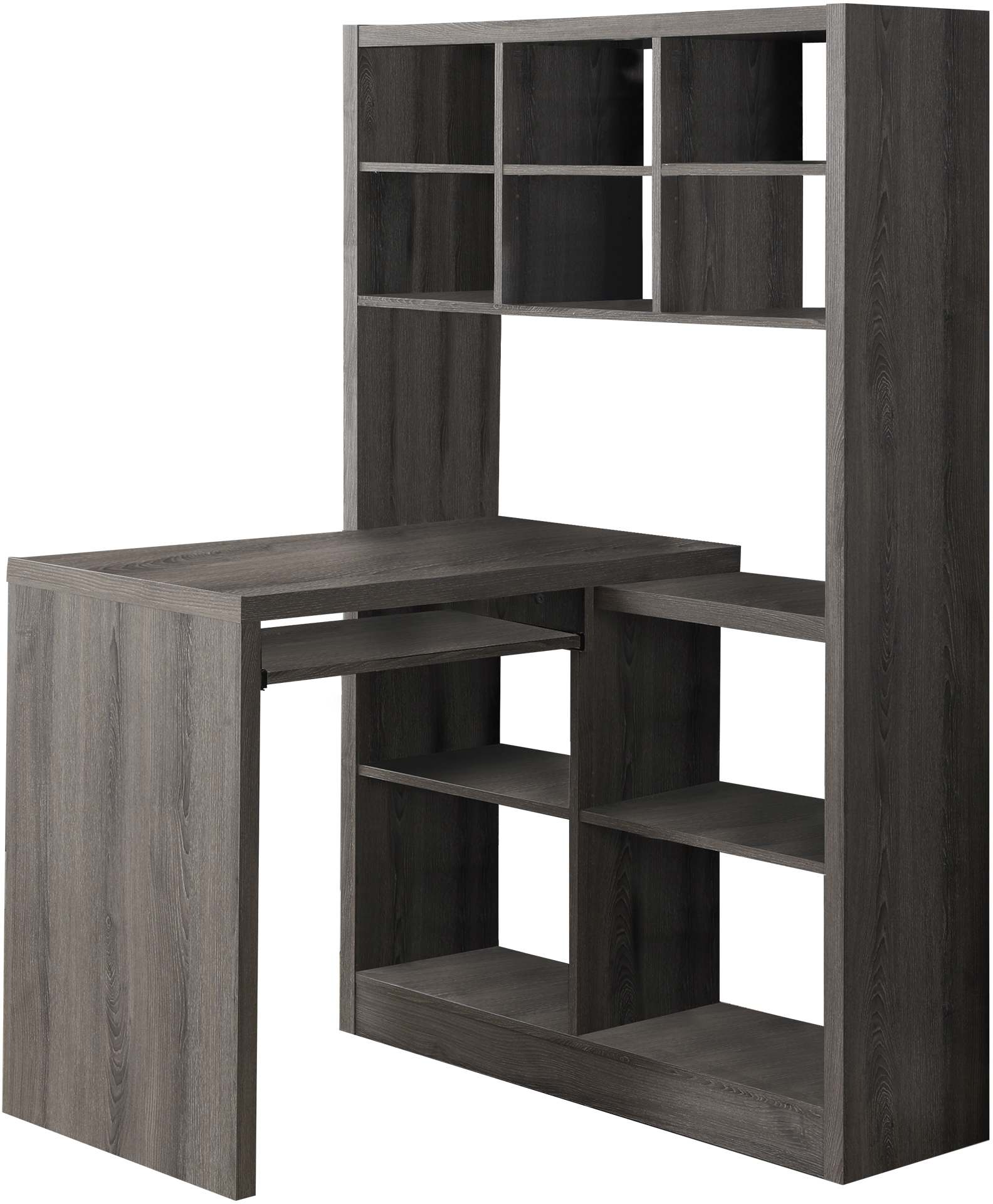 This unique, contemporary style desk and shelf unit offers the ideal combination for your home office. Finished on all sides in an elegant dark taupe wood-look, the thick paneled desk features an easy glide pull-out keyboard tray and ample side storage space which can be positioned to the left or right of the desk allowing you to customize your space as needed. The convenient attached bookcase with adjustable shelving provides plenty of space to store books, paperwork, or decorative objects. A versatile design piece to place anywhere in your home and office space.