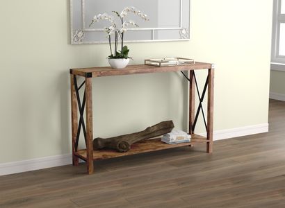 Cette table console à 2 niveaux offre une façon élégante de décorer des espaces étroits, comme une entrée ou un couloir. Utilisez le dessus de table pour afficher des cadres photo ou pour déposer vos clés lorsque vous arrivez à la maison. L'espace entre le dessus de table et la tablette inférieure est idéal pour les articles de décoration hauts, tels que les vases à fleurs ou les pots décoratifs. Le cadre élancé en métal noir décrit les panneaux qui sont dans une finition faux bois brun. Les accents en forme de X sur les côtés du cadre ajoutent une touche décorative. Étroite et haute, cette table d'appoint peut également être utilisée derrière un canapé dans un salon.En savoir plusRead More